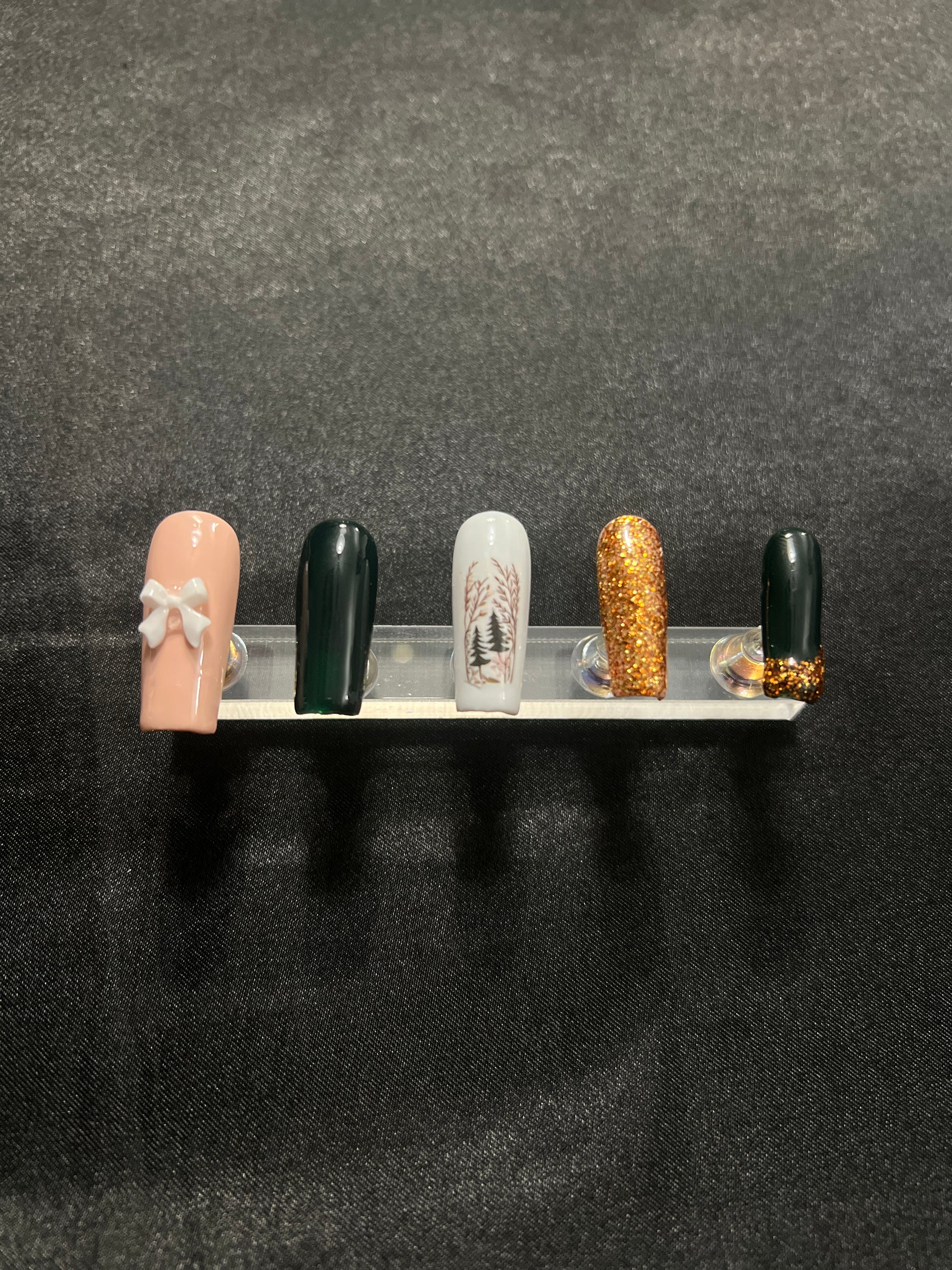 Featuring a hand-painted evergreen forest, 3D sculpted bow, and rich gold glitter — this set blends chic holiday glamour with cozy winter charm. Perfect for Christmas parties, holiday photos, winter weddings, or anyone who loves a timeless luxe holiday look.