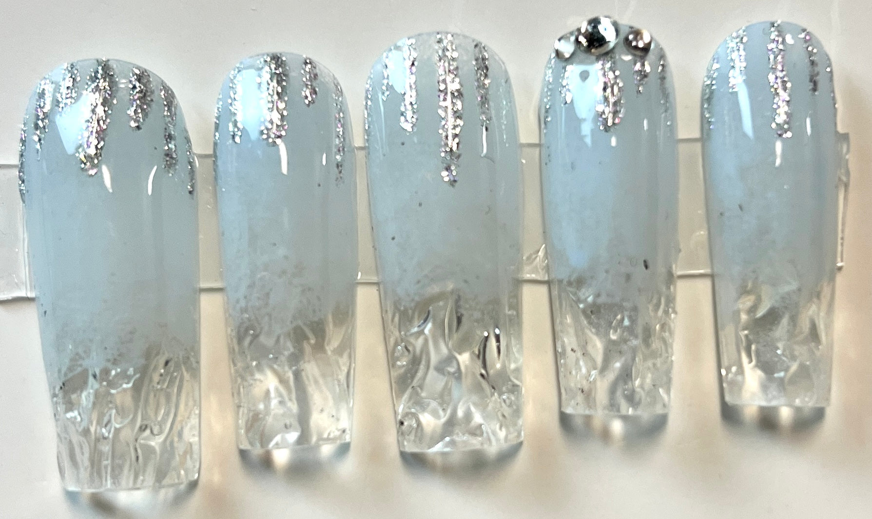 Soft frosty blue melts into clear cracked-ice tips, topped with silver glitter drips and crystal accents. This luxury winter set feels straight out of an ice queen fantasy — elegant, frosty, and magical.