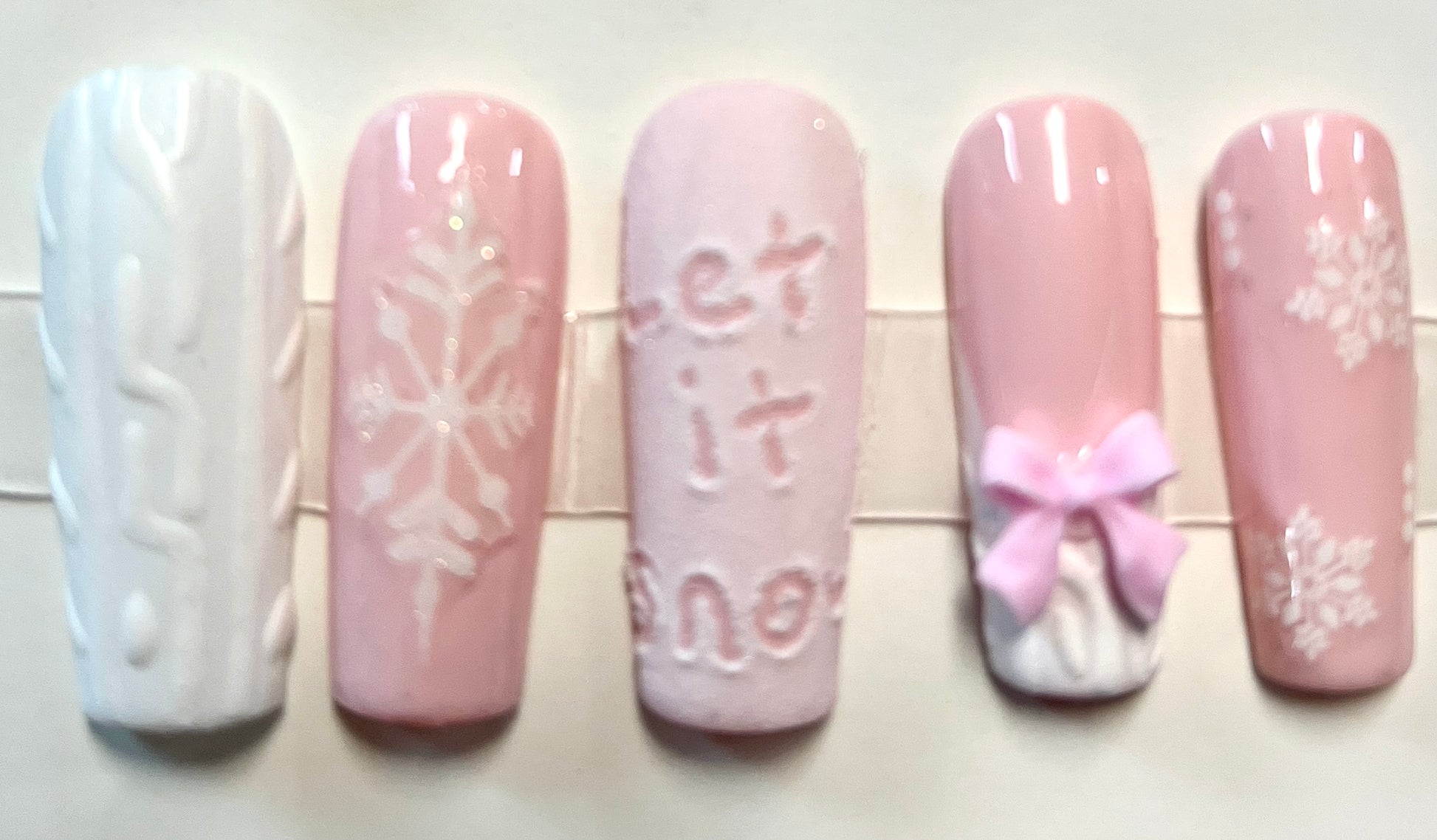 Pretty-in-pink for the cozy girlies. This set features raised sweater-knit texture, soft snowflakes, “Let It Snow” detailing, and a 3D bow accent nail. A cute, feminine winter look for anyone obsessed with soft pink vibes