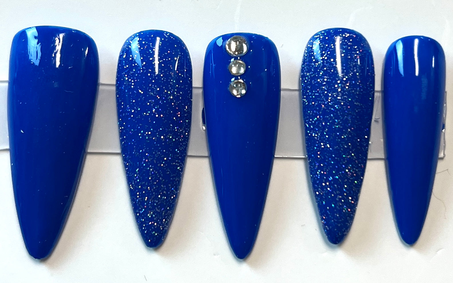 A bold, royal blue winter moment. Featuring glitter accent nails and a simple crystal trio, this set gives icy elegance with a pop of color. Perfect for anyone who loves deep jewel tones.